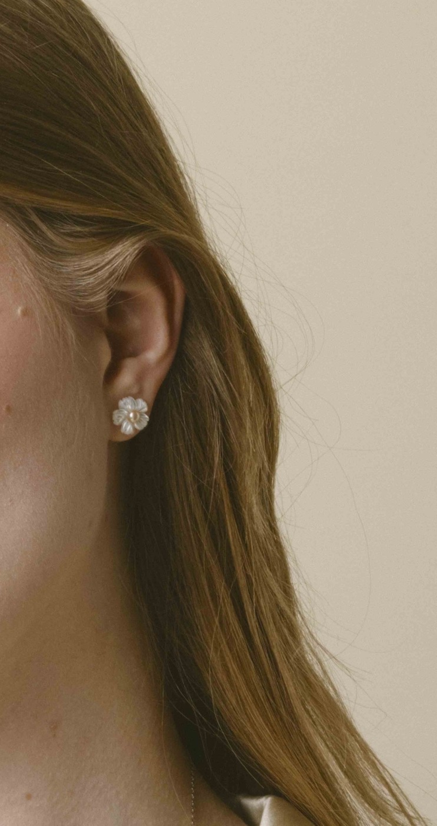 Pink Freshwater Button-Shape Cultured Pearl on Mother of Pearl Flower Lotus Earrings