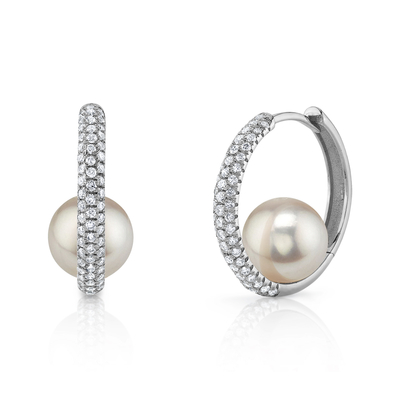 These exquisite hoop earrings feature 8mm high-quality Japanese Akoya pearls, handpicked for their incredible luster and overtones. The pearls are mounted on the finest 18K gold with 0.58 carats of dazzling SI clarity diamonds. These earrings come packaged in a beautiful jewelry gift box, perfect for gifting.